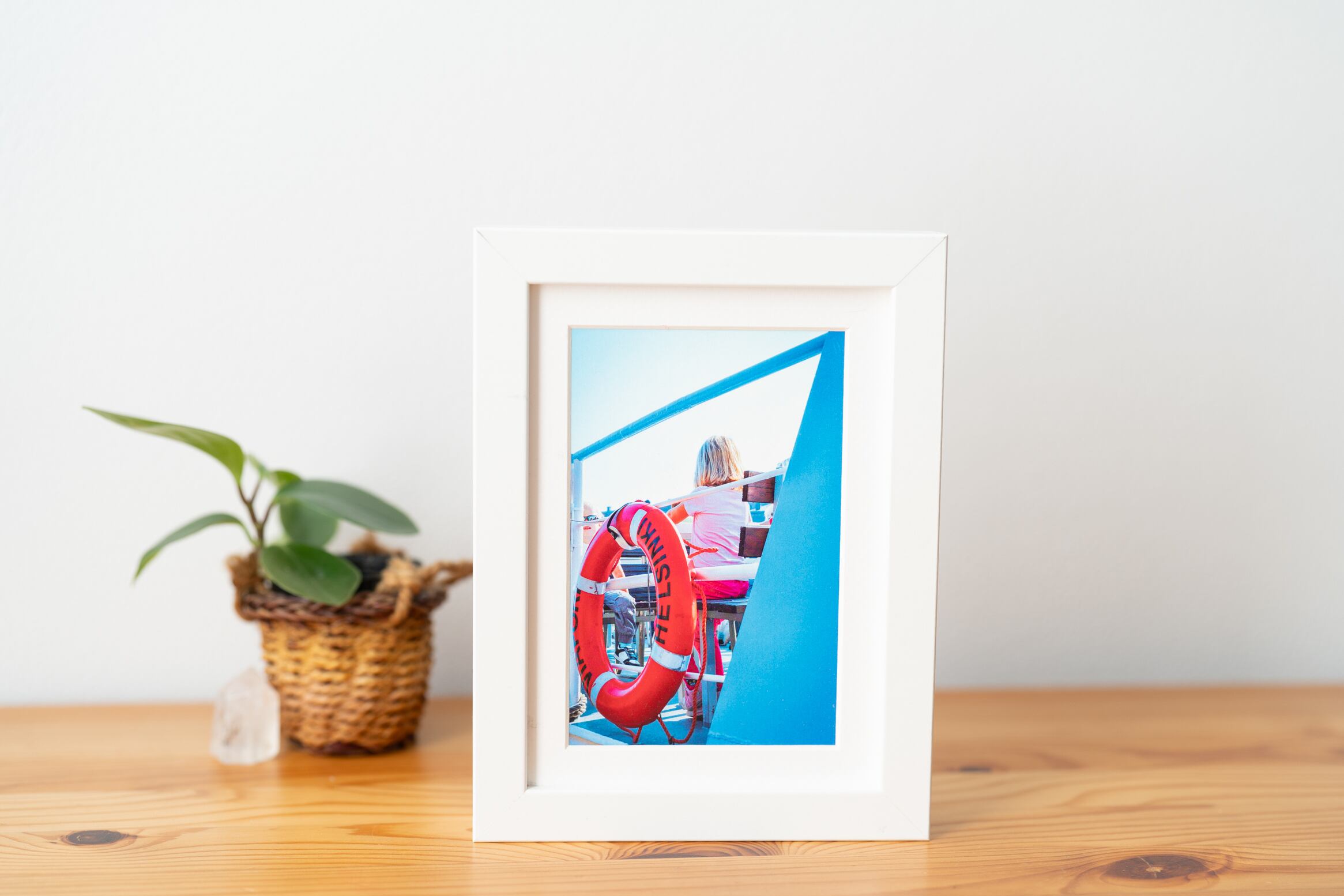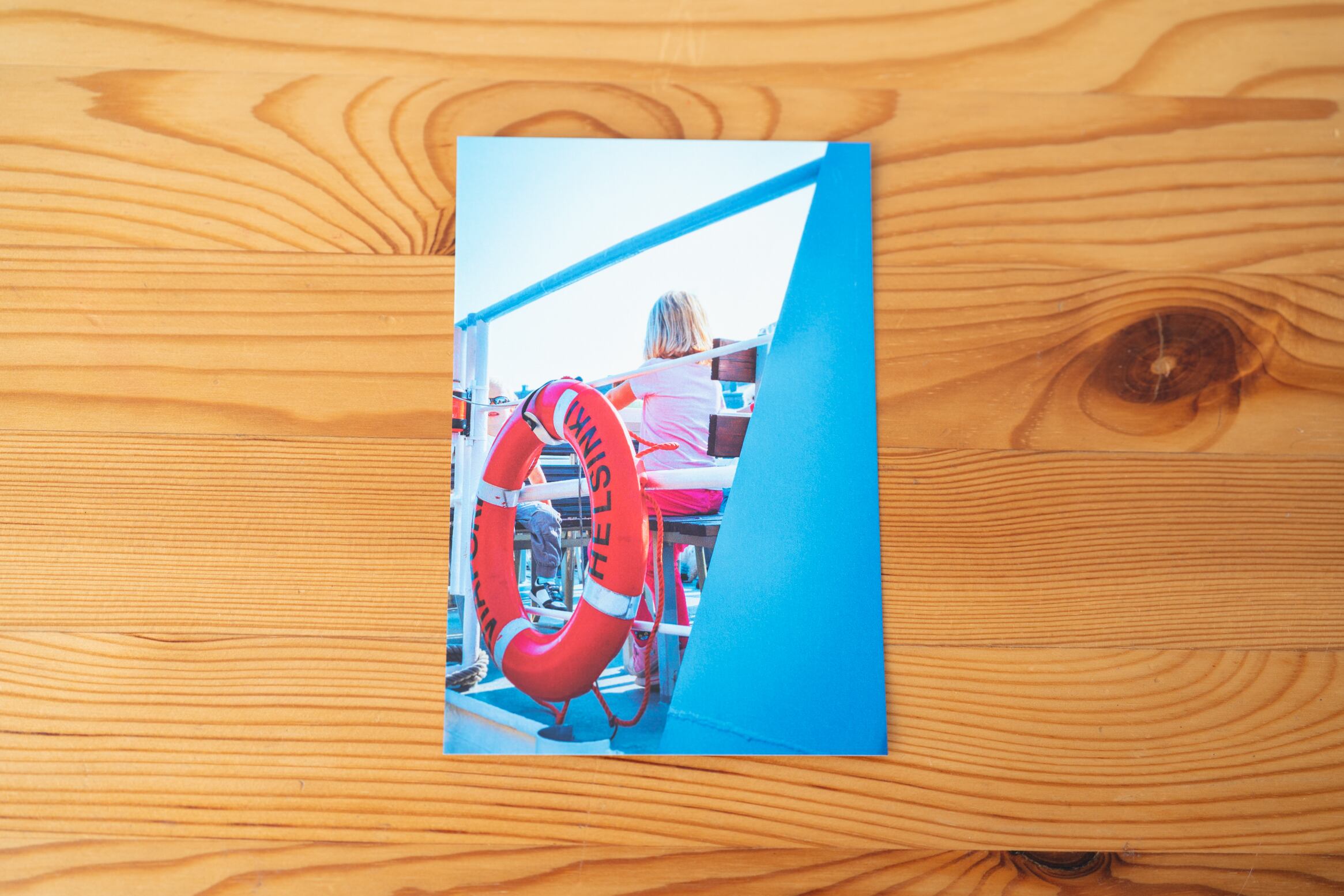 こちらのポストカードは、ヘルシンキの海を進む船のブルー、カラフルな浮き輪とマッチした綺麗なピンク色のTシャツの少女のカラーコラボが特徴です。