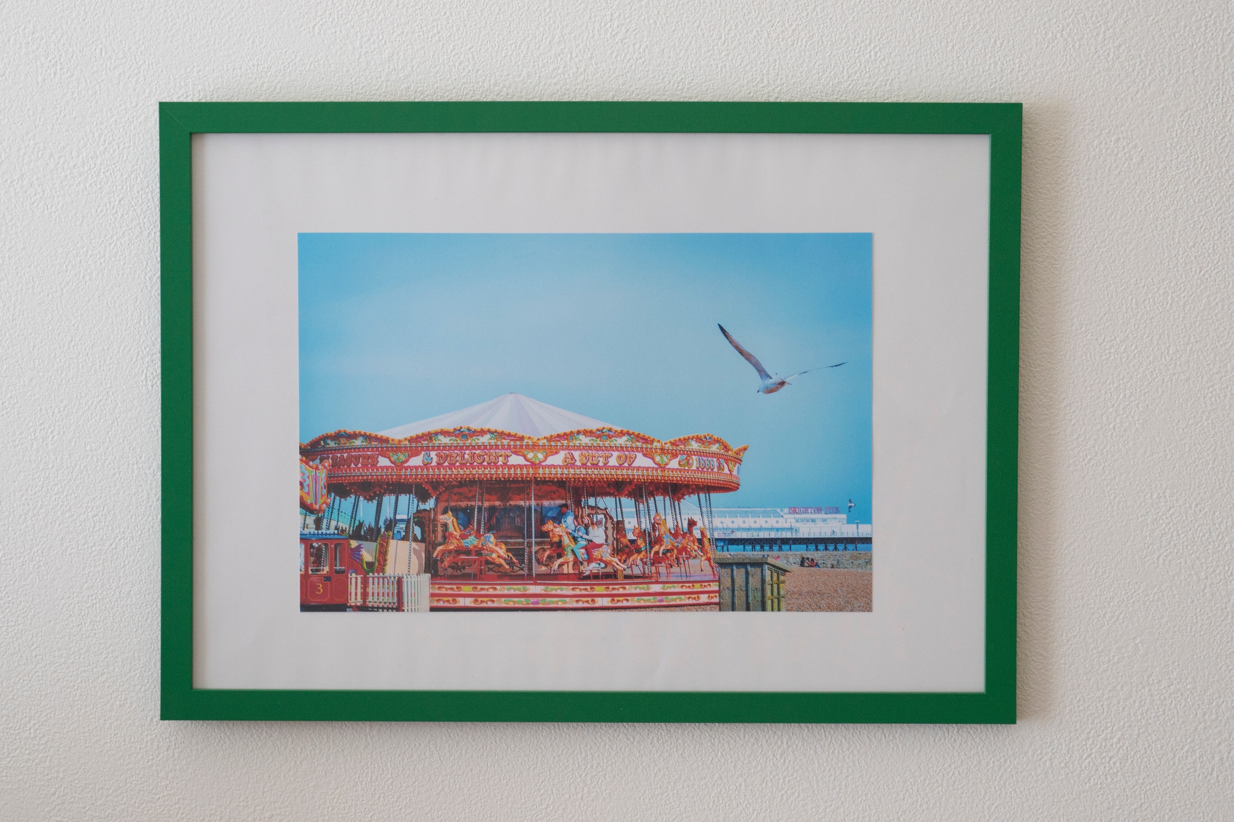 美しいビーチに設置されたメリーゴーランドを切り取った特別なA4写真をお届けします。こちらの写真は、青い海と白い砂浜を背景に、楽しげに回るメリーゴーランドの姿が描かれており、その鮮やかな色彩が心に残ります。夏のひとときを思い起こさせる、ワクワク感あふれる風景です。
